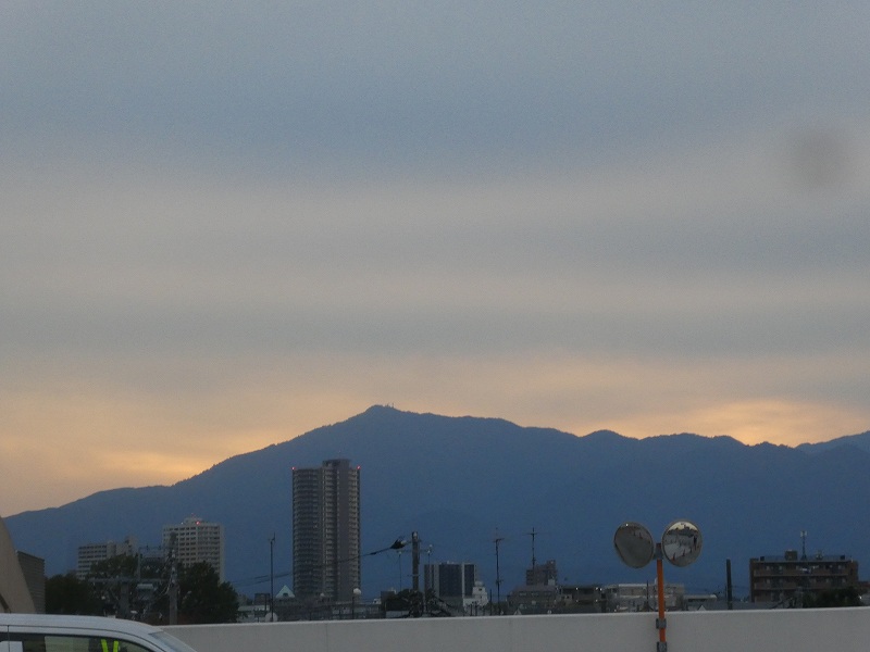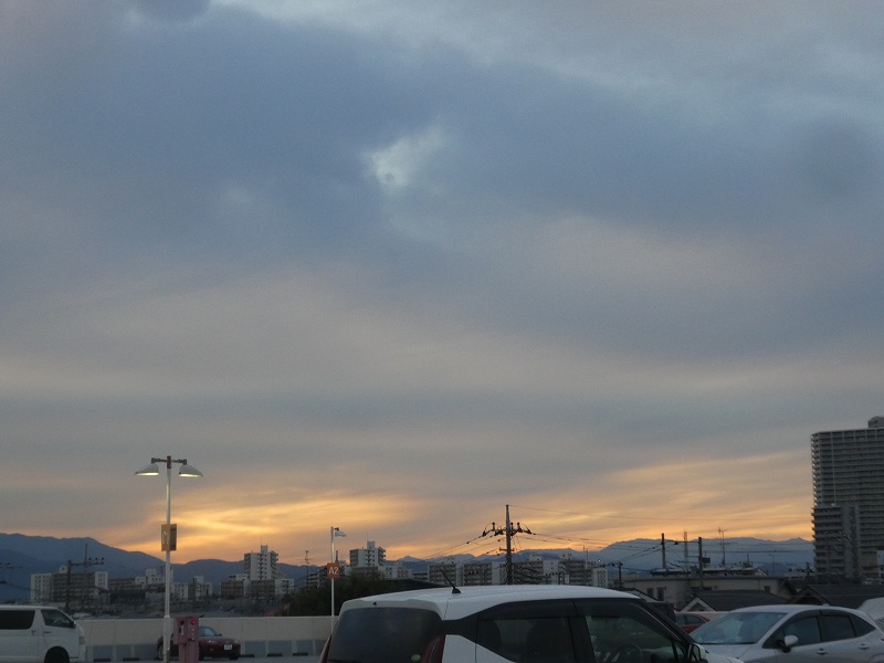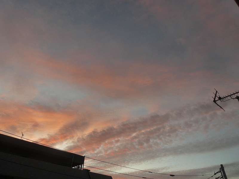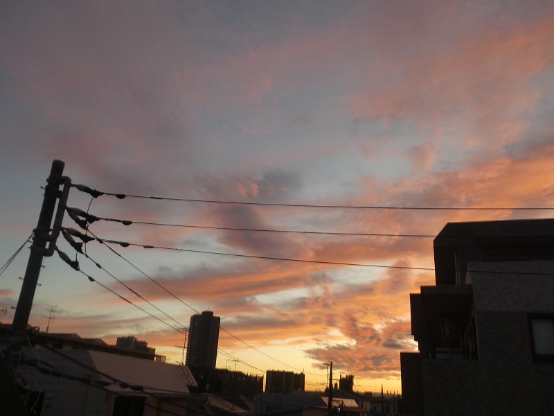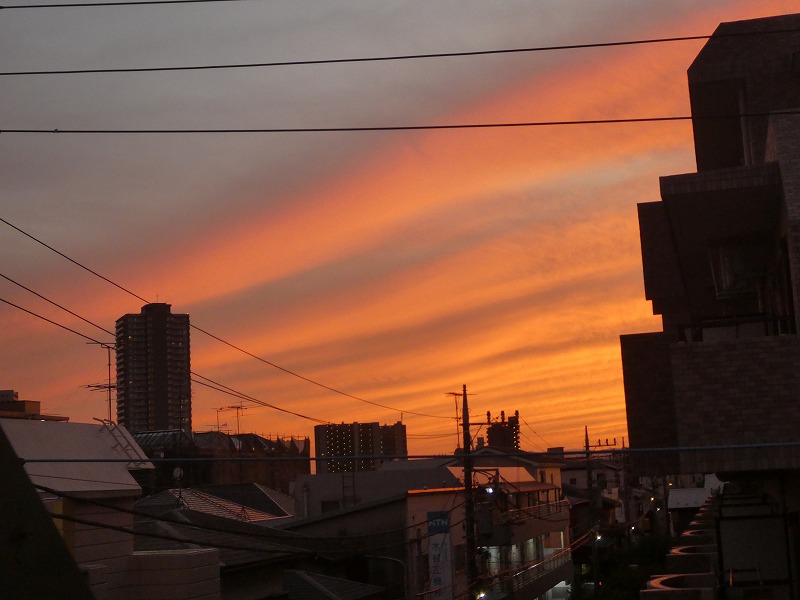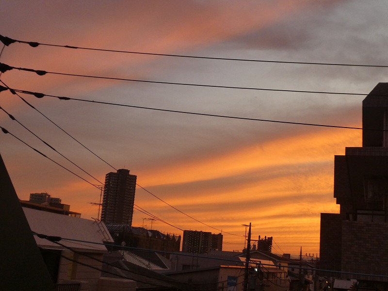 今日の夕焼け 前のマンションを挟んで左 駅前方面 右側はウロコ雲のような?? スーパームーンはさっき家の真上に見えた(^^♪